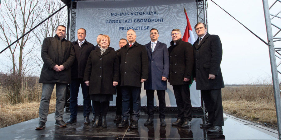 A képen: Nyul Zoltán beruházási vezérigazgató-helyettes – NIF Zrt.; Tiba István országgyűlési képviselő; Ale Erika polgármester – Görbeháza; mögötte Szólláth Tibor polgármester – Hajdúnánás; Tasi Sándor alelnök – Hajdú-Bihar Megyei Önkormányzat; Kósa Lajos országgyűlési képviselő; Papp László polgármester – Debrecen; Jászai Menyhért alpolgármester – Nyíregyháza; Seszták Oszkár elnök – Szabolcs-Szatmár-Bereg Megyei Önkormányzat
