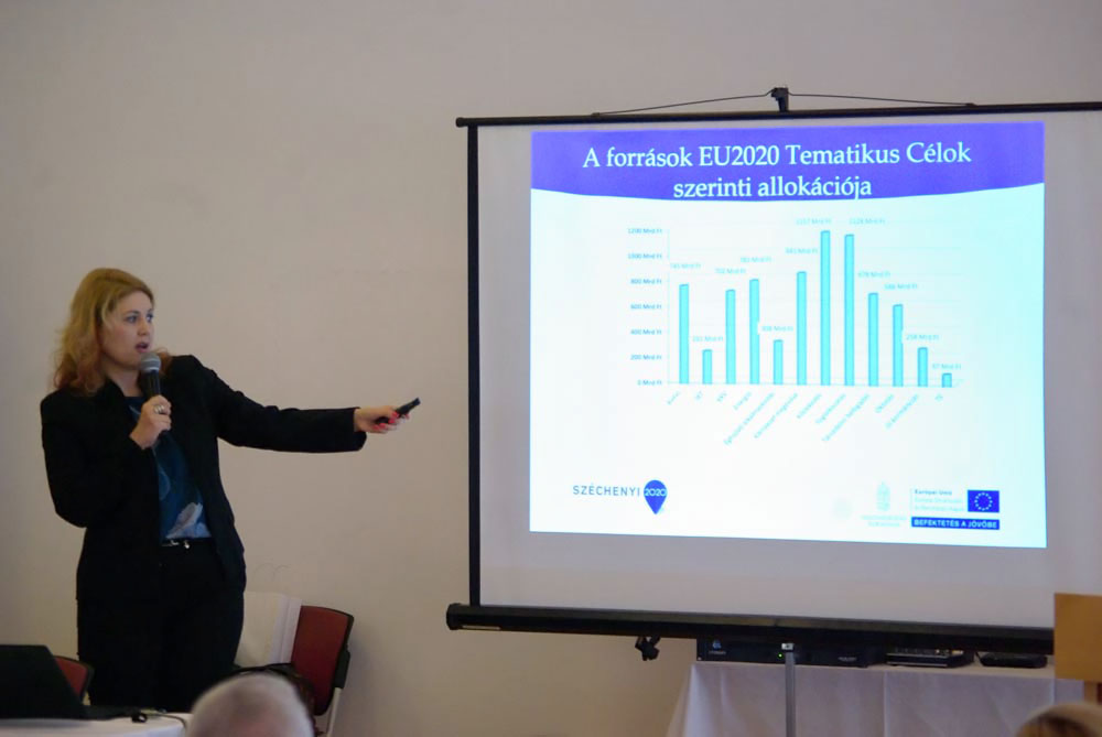 A főosztályvezető-helyettes a 2014-2020 közötti uniós programozási időszak általános kereteit felidézve emlékeztetett, a fejlesztések irányát tizenegy tematikus cél mentén határozták meg, ezek közül a gazdaságfejlesztésre jut a legnagyobb forrás, melyre az összes forrás 60 százalékát kell fordítani. Ugyancsak emlékeztetett, új elemként jelent meg a területi kiválasztási rendszer (TOP, VEKOP).