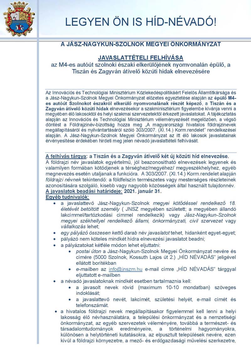 2021.01.05. A Jász-Nagykun Megyei Önkormányzat javaslattételi felhívása az M4-es autóút szolnoki északi elkerülőjének nyomvonalán épülő, a Tiszán és Zagyván átívelő közúti hidak elnevezésére.