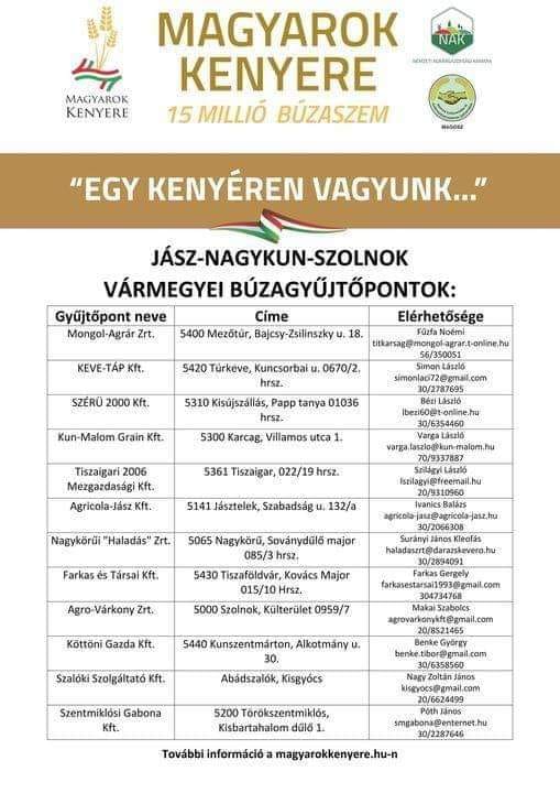 2024.07.29. A “Magyarok Kenyere – 15 millió búzaszem” elnevezésű, határon átívelő jótékonysági akció keretében, július 22-25 között az alábbi gyűjtőpontokon fogadják a búza felajánlásokat Jász-Nagykun-Szolnok vármegyében.