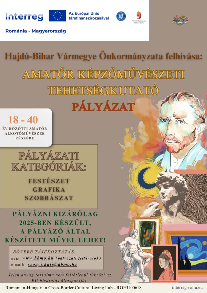 2025.08.22. Az Interreg VI-A Romania-Hungary Program „Romanian-Hungarian Cross-Border Cultural Living Lab” című pályázat keretében „Amatőr Képzőművészeti Tehetségkutató pályázatra” Hajdú-Bihar Vármegye Önkormányzata képzőművészeti pályázatot hirdet 18-40 év közötti, amatőr alkotóművészek részére.