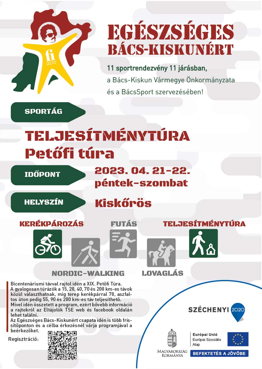 Első rendezvényünk – ahol megtalálható lesz az Egészséges Bács-Kiskunért csapata – Kiskőrösön lesz április 21-22-én. A XIX. Petőfi Túra változatos elemekkel várja a természetbe vágyókat. A teljesítménytúrázók több táv, köztük a 200 km közül is választhatnak, de a változatos útvonalak terep-, illetve országúti kerékpárral is teljesíthetők lesznek. A programról részletesen a BácsSport Facebook-oldalán kaphat információt, regisztrálni pedig itt lehet.
