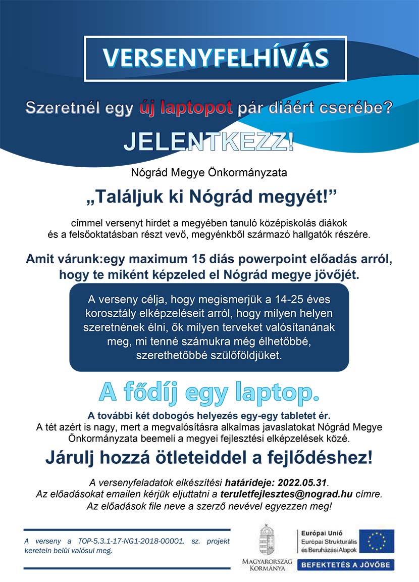 2022.04.14. A Nógrád Megyei Önkormányzat „Találjuk ki Nógrád megyét” címmel versenyt hirdet a megyében tanuló középiskolás diákok és a felaőoktatásban részt vevő, Nógrádból származó hallgatók részére.