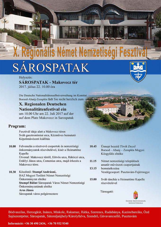 2017.07.21. Sárospatak városa ad otthont szombaton a X. Regionális Német Nemzetiségi Fesztiválnak, amely délelőtt 10 órakor a résztvevők felvonulásával kezdődik.