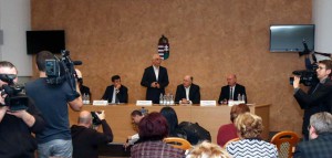 2016. január 27. Balog Zoltán, az emberi erőforrások minisztere beszél, mellette, Sipos Imre, az Emberi Erőforrások Minisztériuma helyettes államtitkára (j4), Kriza Ákos polgármester (j2) és Kiss Gábor alpolgármester az Országjárás az oktatásról elnevezésű programsorozat első fórumán a miskolci városházán 2016. január 27-én. MTI Fotó: Vajda János