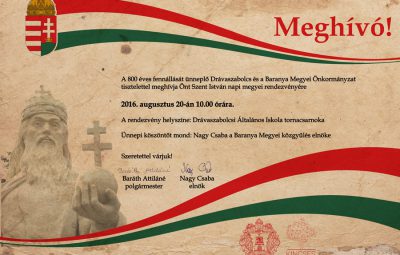 2016.08.05. A 800 éves fennállását ünneplő Drávaszabolcs és a Baranya Megyei önkormányzat tisztelettel meghívja önt Szent...
