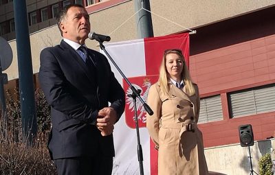 Lengyel zászló magyar szélben – ünnepélyes ceremónia a kecskeméti megyeháza előtt